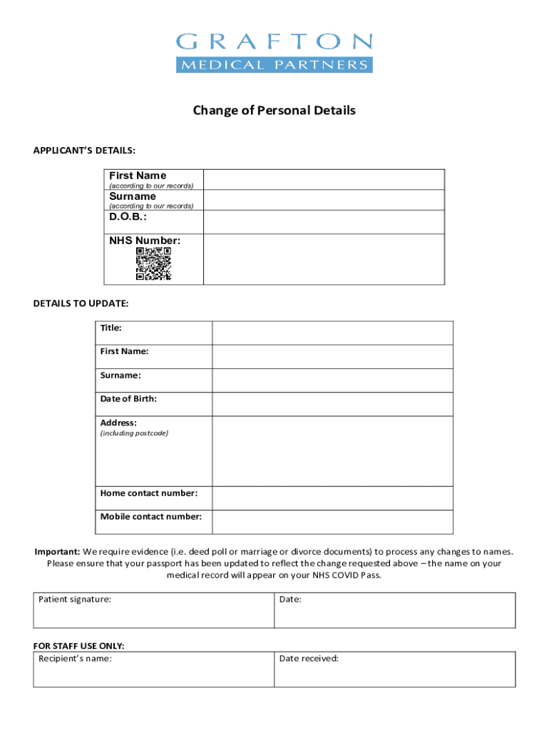 Change of Personal Details APPLICANTS DETAILS: First Name (according to our records)Surname (according to our records)D.O.B.: NHS Number:DETAILS TO UPDATE: Title: First Name: Surname: Date of Birth: