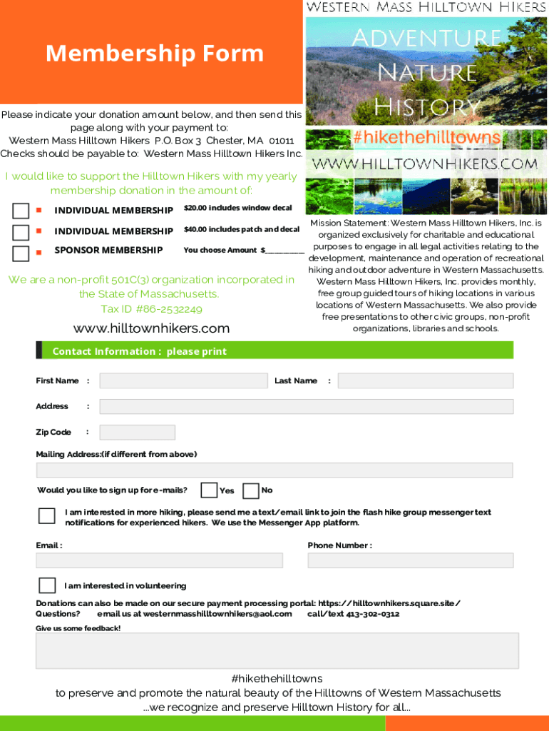 Membership Form Please indicate your donation amount below, and then send this page along with your payment to: Western Mass Hill town Hikers P.O. Box 3 Chester, MA 01011 Checks should be payable