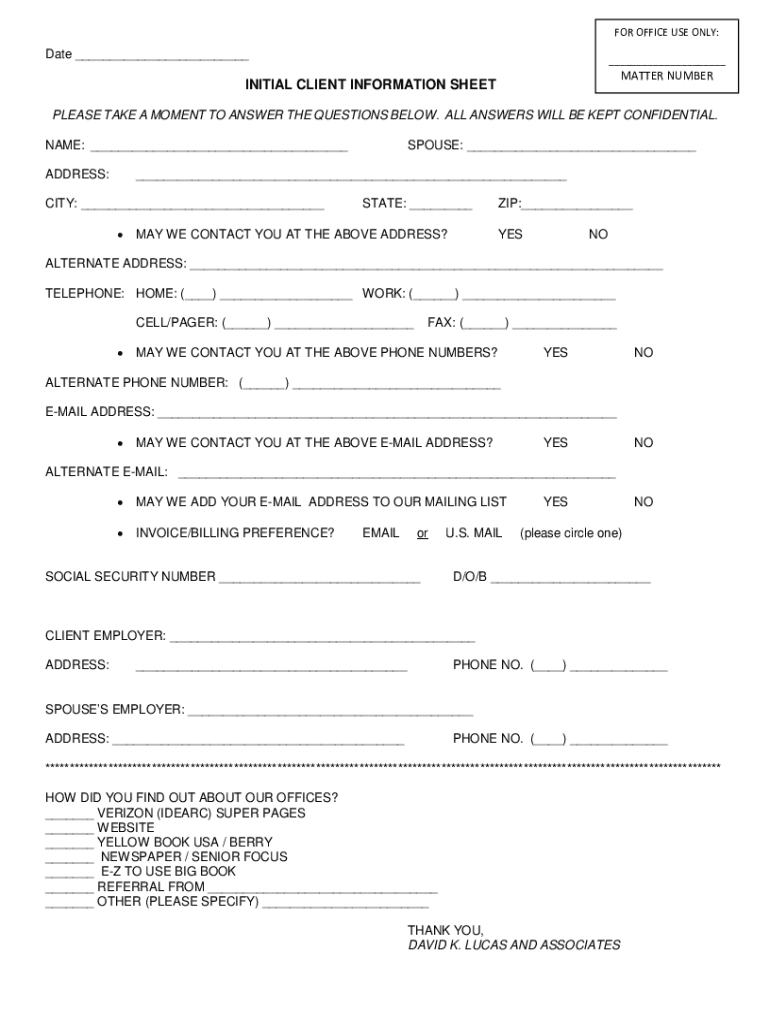 FOR OFFICE USE ONLY:Date ______MATTER NUMBERINITIAL CLIENT INFORMATION SHEETPLEASE TAKE A MOMENT TO ANSWER THE QUESTIONS BELOW. ALL ANSWERS WILL BE KEPT CONFIDENTIAL. NAME: ___ ADDRESS:SPOUSE: ______CITY: