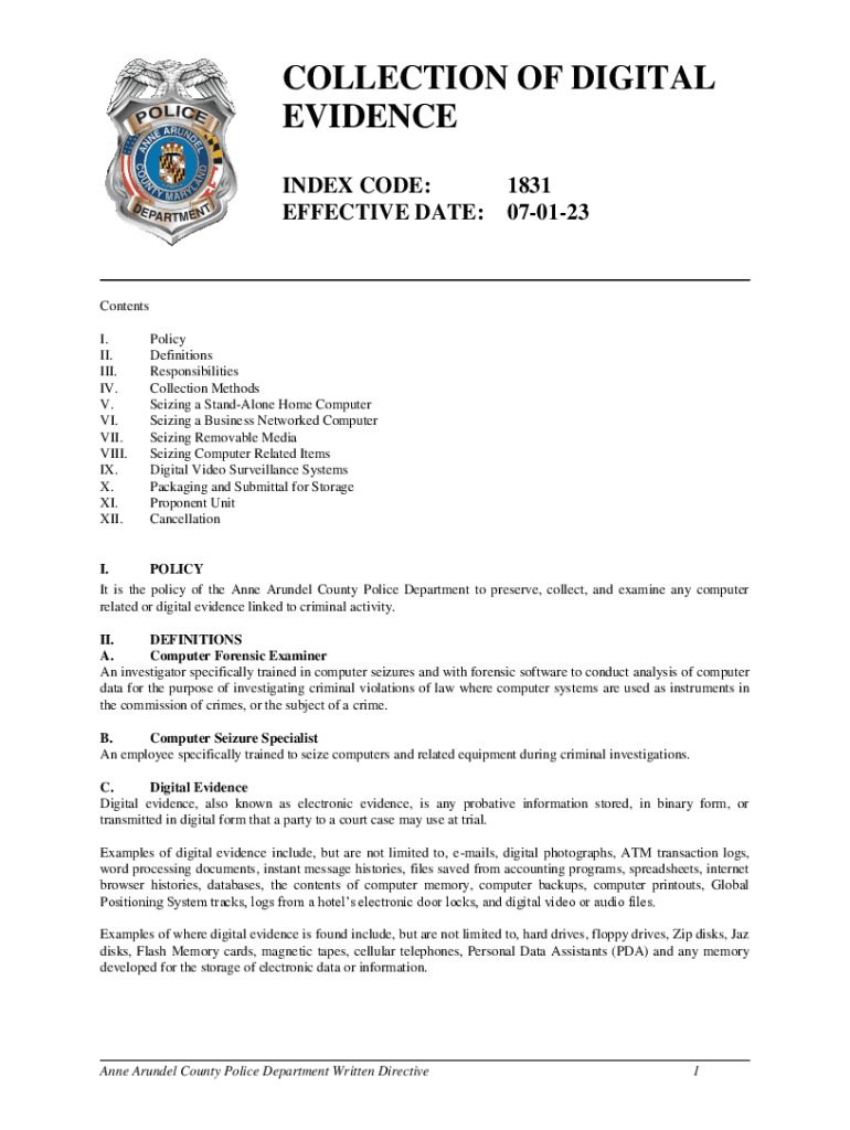 COLLECTION OF DIGITAL EVIDENCE INDEX CODE: EFFECTIVE DATE:1831 070123Contents I. II. III. IV. V. VI. VII. VIII. IX. X. XI. XII. Policy Definitions Responsibilities Collection Methods Seizing a StandAlone