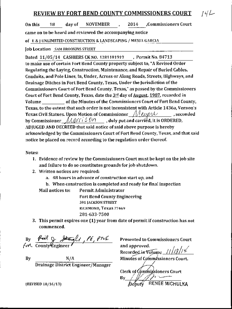 On this18day November 2014__, Commissioners Court came on to be heard and reviewed the accompanying notice of E & J UNLIMITED CONSTRUCTION & LANDSCAPING