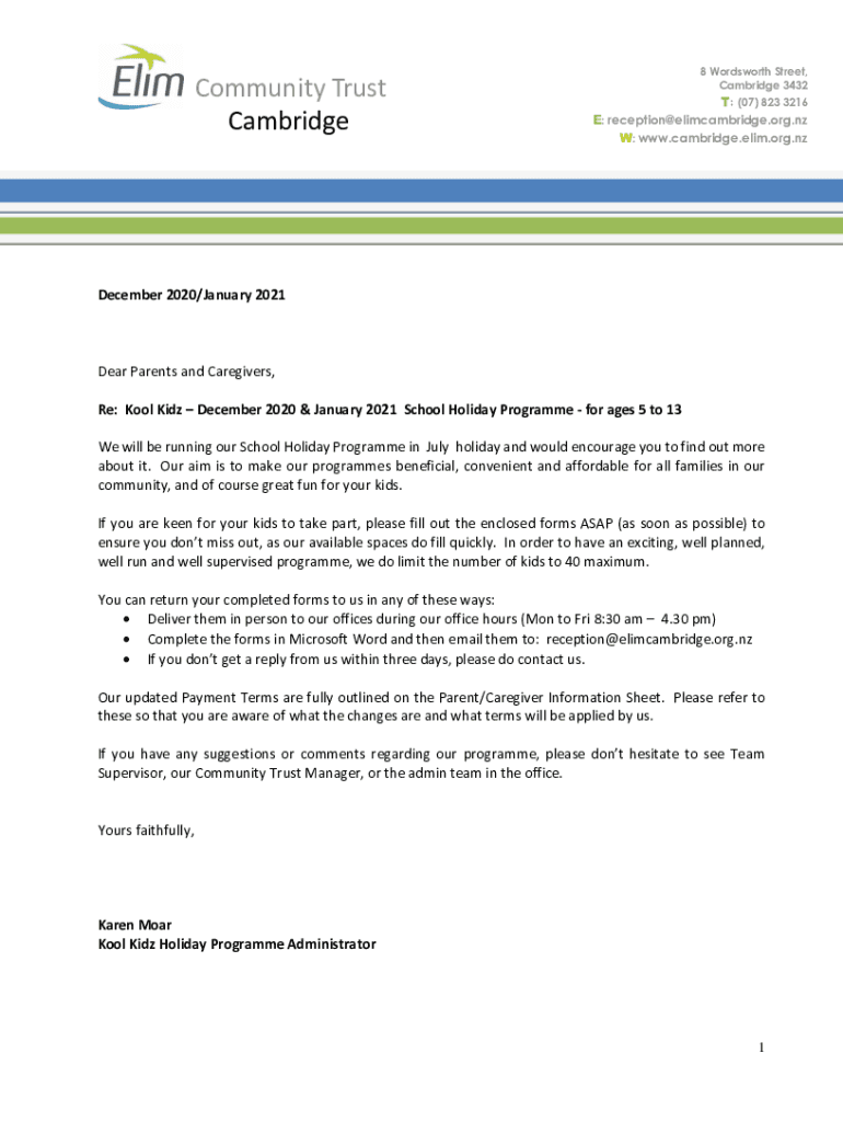 8Community Trust Cambridge8 Wordsworth Street, Cambridge 3432 T: (07) 823 3216E: reception@elimcambridge.org.nz W: www.cambridge.elim.org.nzDecember 2020/January 2021Dear Parents and Caregivers, Re: