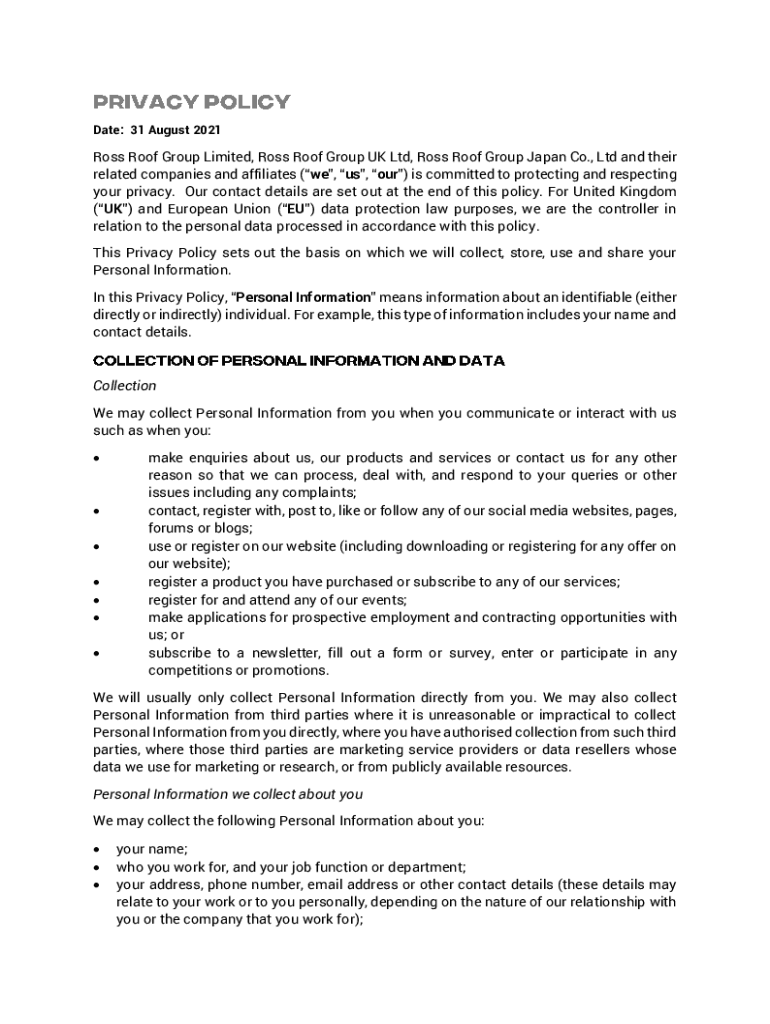Date: 31 August 2021Ross Roof Group Limited, Ross Roof Group UK Ltd, Ross Roof Group Japan Co., Ltd and their related companies and affiliates (we, us, our) is committed to protecting and respecting