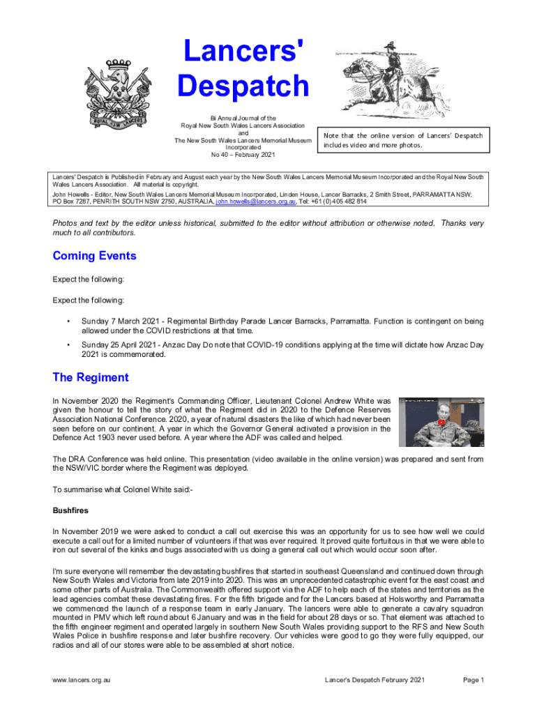 Lancers\' Despatch Bi Annual Journal of the Royal New South Wales Lancers Association and The New South Wales Lancers Memorial Museum Incorporated No 40 February 2021Note that the online version of