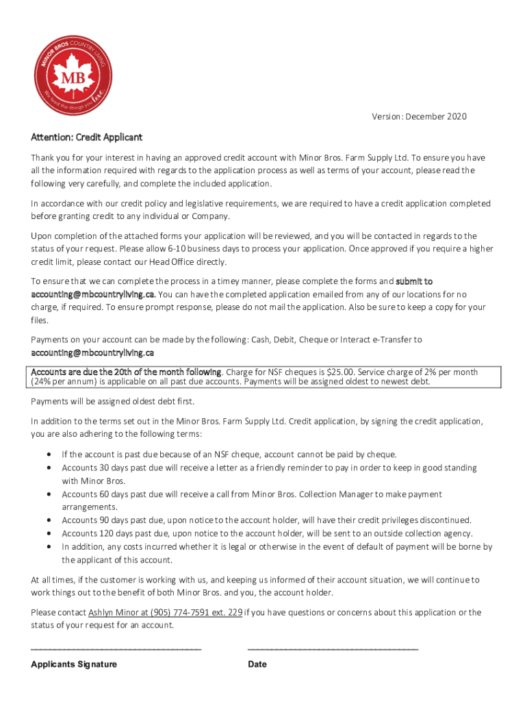 Version: December 2020Attention: Credit Applicant Thank you for your interest in having an approved credit account with Minor Bros. Farm Supply Ltd. To ensure you have all the information required