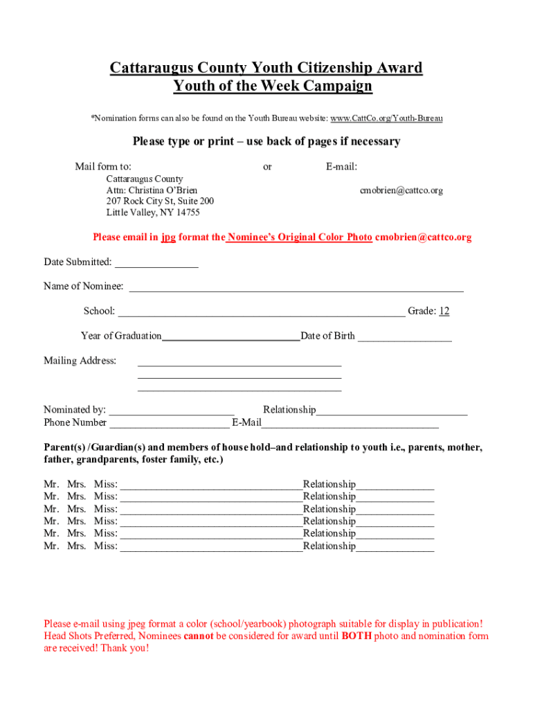 Get the free Nomination Form for Cattaraugus County Youth Citizenship Award