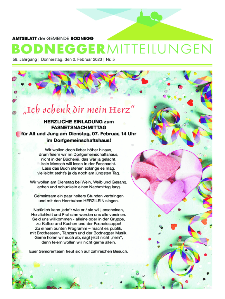 AMTSBLATT her REMAINDER BODNEGG58. Charging | Donner stag, den 2. February 2023 | NR. 5Ich Schenck Dir man Her