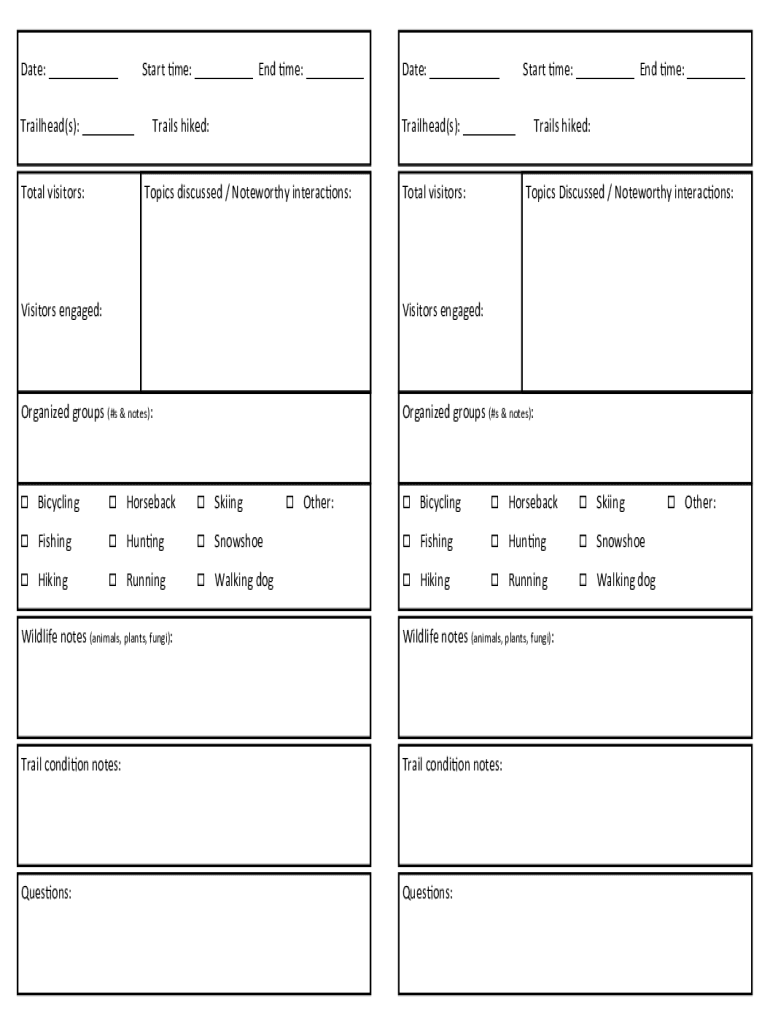 Date: ___Start time: ___ End time: ___Trailhead(s): ___ Total visitors:Trails hiked:Date: ___Start time: ___ End time: ___Trailhead(s): ___Topics discussed / Noteworthy interactions:Total visitors:Trails