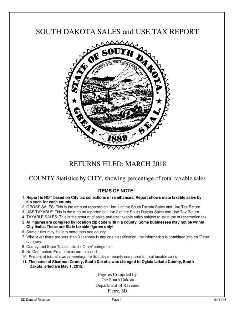 SOUTH DAKOTA SALES and USE TAX REPORTRETURNS FILED: MARCH 2018 COUNTY Statistics by CITY, showing percentage of total taxable sales ITEMS OF NOTE: 1. Report is NOT based on City tax collections or