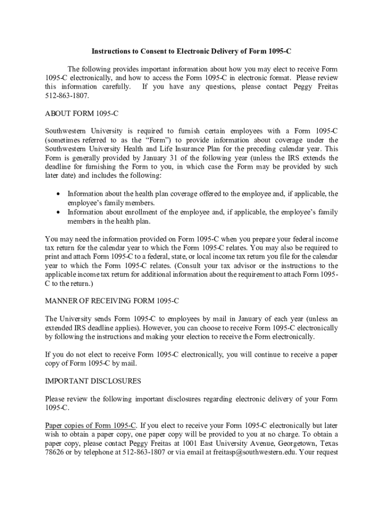 Instructions to Consent to Electronic Delivery of Form 1095C The following provides important information about how you may elect to receive Form 1095C electronically, and how to access the Form 1095C