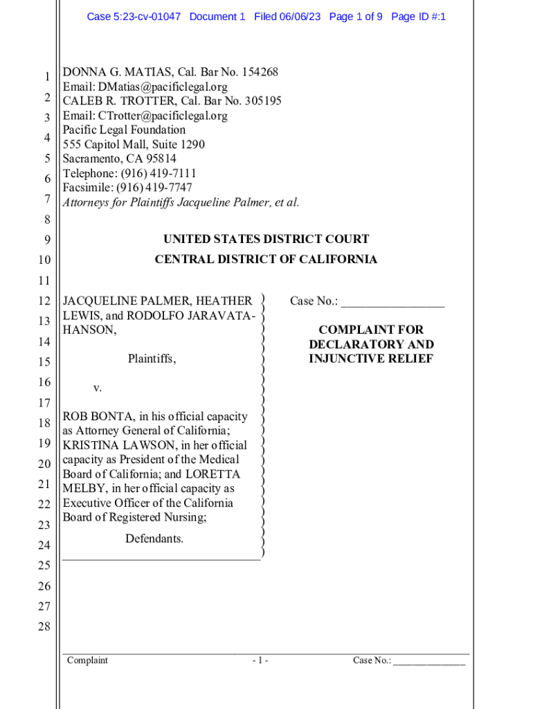Case 5:23cv01047 Document 1 Filed 06/06/23-Page 1 of 9-Page ID #:11 2 3 4 5 6 7DONNA G. MATÍAS, Cal. Bar No. 154268 Email: DMatias@pacificlegal.org CALEB R. TROTTER, Cal. Bar No. 305195 Email: CTrotter@pacificlegal.org