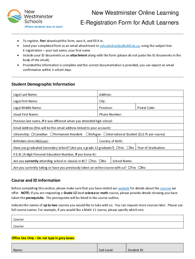New Westminster Online Learning Registration Form for Adult Learners To register, first download this form, save it, and fill it in. Send your completed form as an email attachment to virtualschoolbc@sd40.bc.ca,