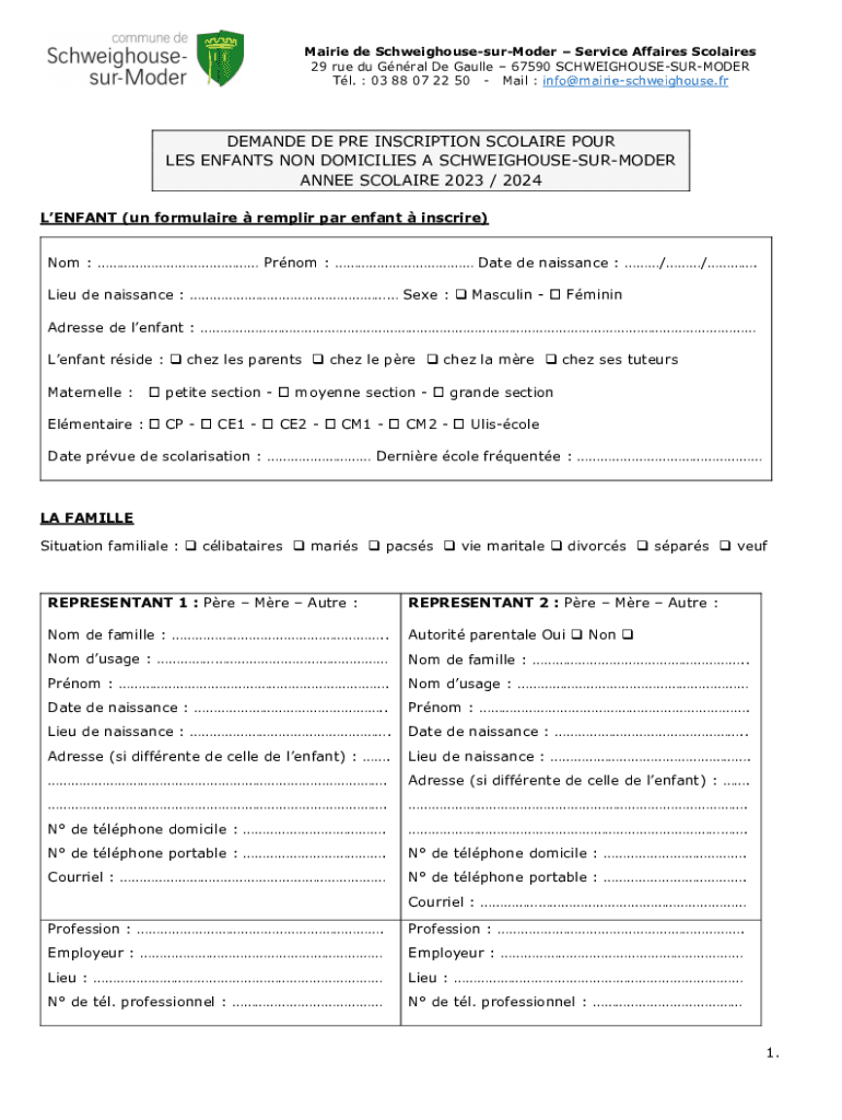 Tl. 03 88 07 22 50 Mail : info@mairieschweighouse.frDEMANDE DE PRE INSCRIPTION CLAIRE POUR