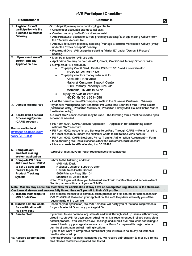 EVS Participant Checklist Requirements 1. Register for EVS participation via the Business Customer Gateway2. Open a unique EVS permit and pay Application Comments Go to https://gateway.usps.com/bcg/login.htm