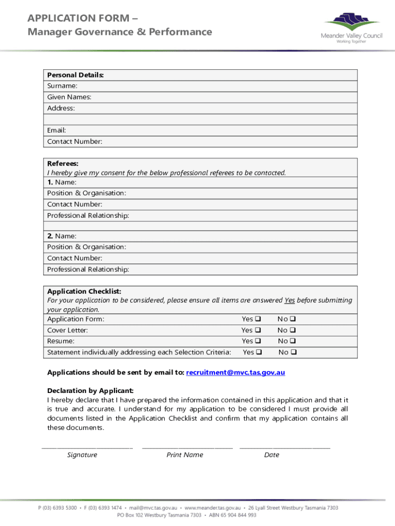 APPLICATION FORM Manager Governance & PerformancePersonal Details: Surname: Given Names: Address: Email: Contact Number: Referees: I hereby give my consent for the below professional referees to be