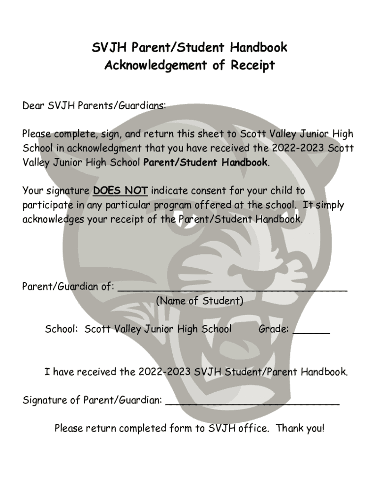 SUCH Parent/Student Handbook Acknowledgement of Receipt Dear SUCH Parents/Guardians: Please complete, sign, and return this sheet to Scott Valley Junior High School in acknowledgement that you have
