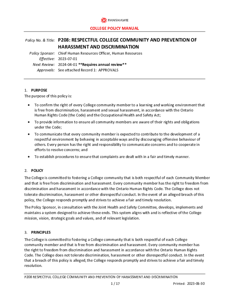 COLLEGE POLICY MANUAL Policy No. & Title: Policy Sponsor: Effective: Next Review: Approvals:P208: RESPECTFUL COLLEGE COMMUNITY AND PREVENTION OF HARASSMENT AND DISCRIMINATIONChief Human Resources