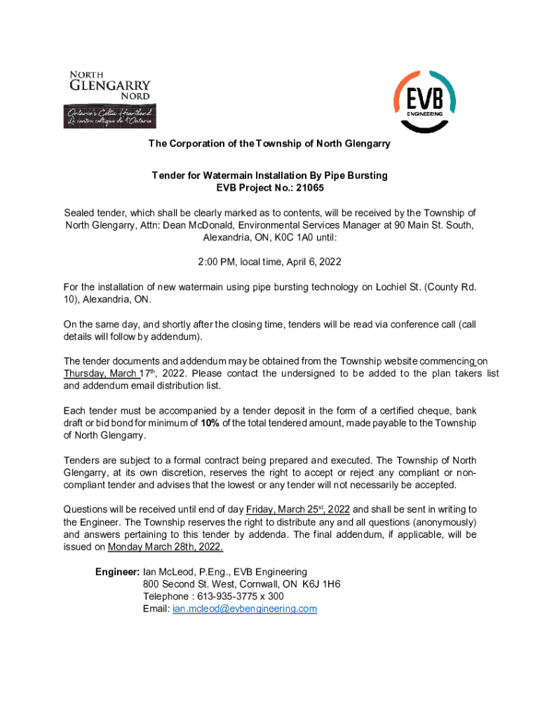 The Corporation of the Township of North Glengarry Tender for Water main Installation By Pipe Bursting EVE Project No.: 21065 Sealed tender, which shall be clearly marked as to contents, will be received