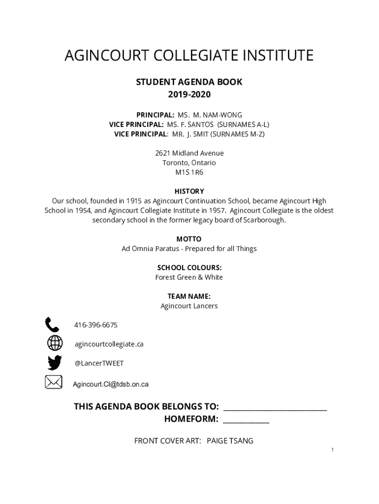 AGINCOURT COLLEGIATE INSTITUTE STUDENT AGENDA BOOK 20192020 PRINCIPAL: MS. M. AMONG VICE PRINCIPAL: MS. F. SANTOS (SURNAMES AL) VICE PRINCIPAL: MR. J. SMITH (SURNAMES MZ) 2621 Midland Avenue Toronto,