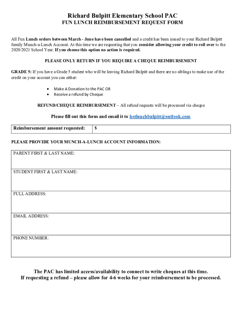 Richard Pulpit Elementary School PAC FUN LUNCH REIMBURSEMENT REQUEST FORM All Fun Lunch orders between March June have been cancelled and a credit has been issued to your Richard Pulpit family MunchaLunch