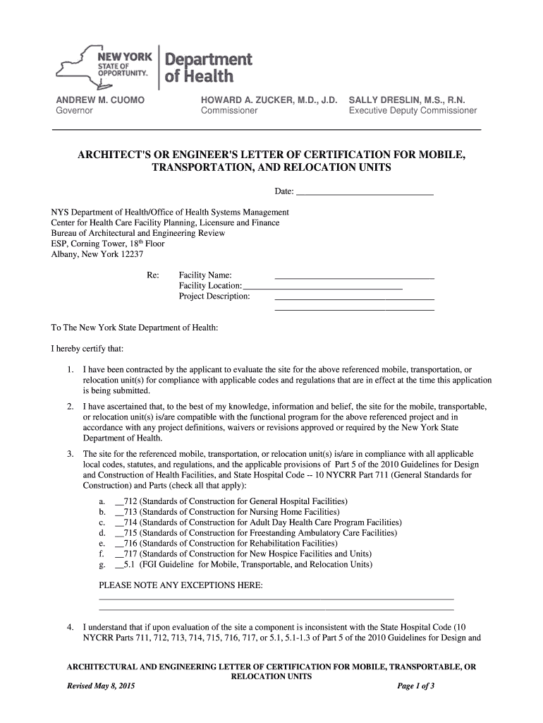 ANDREW M. CUOMO Governor HOWARD A. TUCKER, M.D., J.D. Commissioner SALLY DRESSING, M.S., R.N. Executive Deputy Commissioner ARCHITECT IS OR ENGINEER IS LETTER OF CERTIFICATION FOR MOBILE, TRANSPORTATION,
