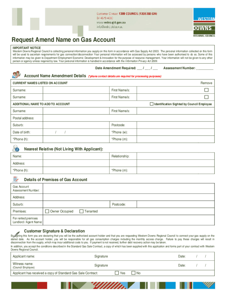 Request Amend Name on Gas Account IMPORTANT NOTICE Western Downs Regional Council is collecting personal information you supply on this form in accordance with Gas Supply Act 2003. The personal information