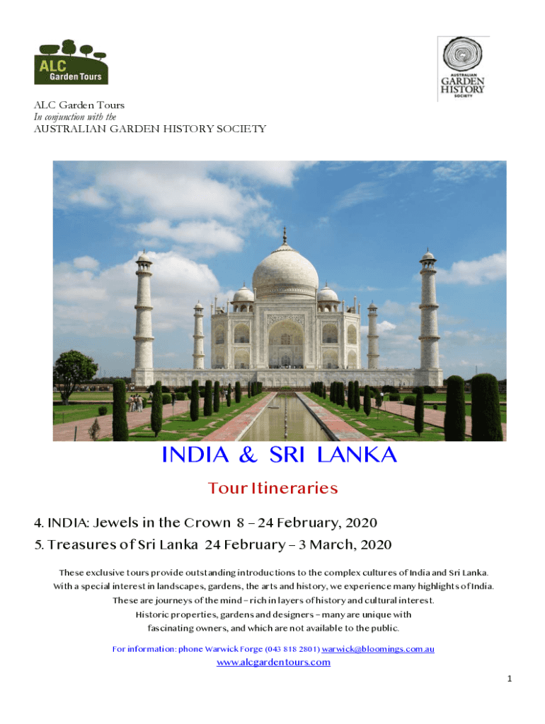 ALC Garden Tours In conjunction with Australian GARDEN HISTORY SOCIETY INDIA & SRI LANKA Tour Itineraries 4. INDIA: Jewels in the Crown 8 24 February 2020 5. Treasures of Sri Lanka 24 February 3 March