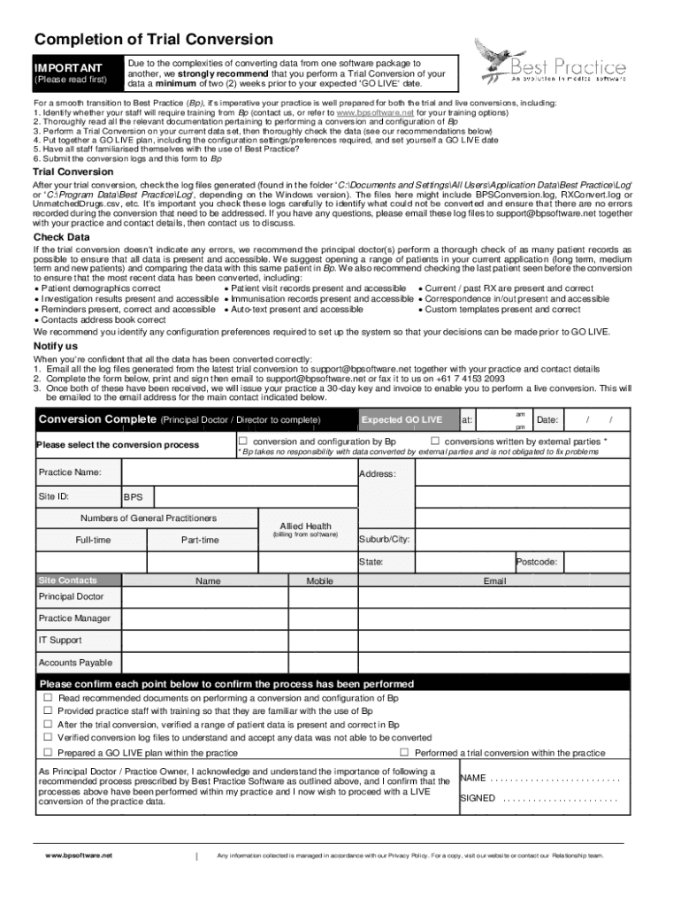 Completion of Trial Conversion IMPORTANT (Please read first)Due to the complexities of converting data from one software package to another, we strongly recommend that you perform a Trial Conversion