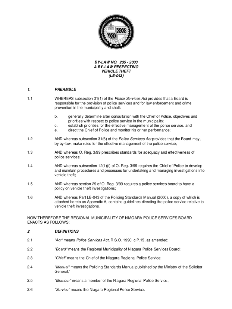 Get the free Niagara Regional Police Service By law Number 235-2000 - Vehicle Theft