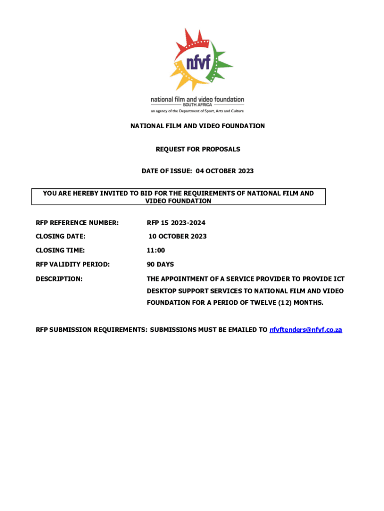 NATIONAL FILM AND VIDEO FOUNDATION REQUEST FOR PROPOSALS DATE OF ISSUE: 04 OCTOBER 2023 YOU ARE HEREBY INVITED TO BID FOR THE REQUIREMENTS OF NATIONAL FILM AND VIDEO FOUNDATION RFP REFERENCE NUMBER:RFP