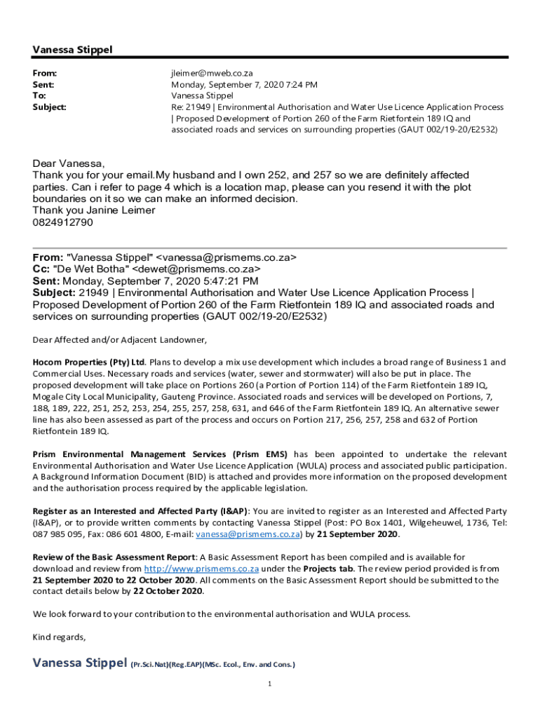 Vanessa Stipple From: Sent: To: Subject:jleimer@mweb.co.ZA Monday, September 7, 2020 7:24 PM Vanessa Stipple Re: 21949 | Environmental Authorization and Water Use License Application Process | Proposed