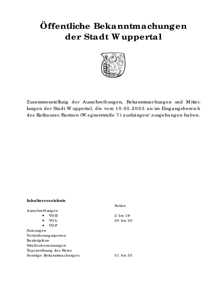 Ffentliche Bekanntmachungender Start WuppertalZusammenstellung her Ausschreibungen, Bekanntmachungen UND Mitten