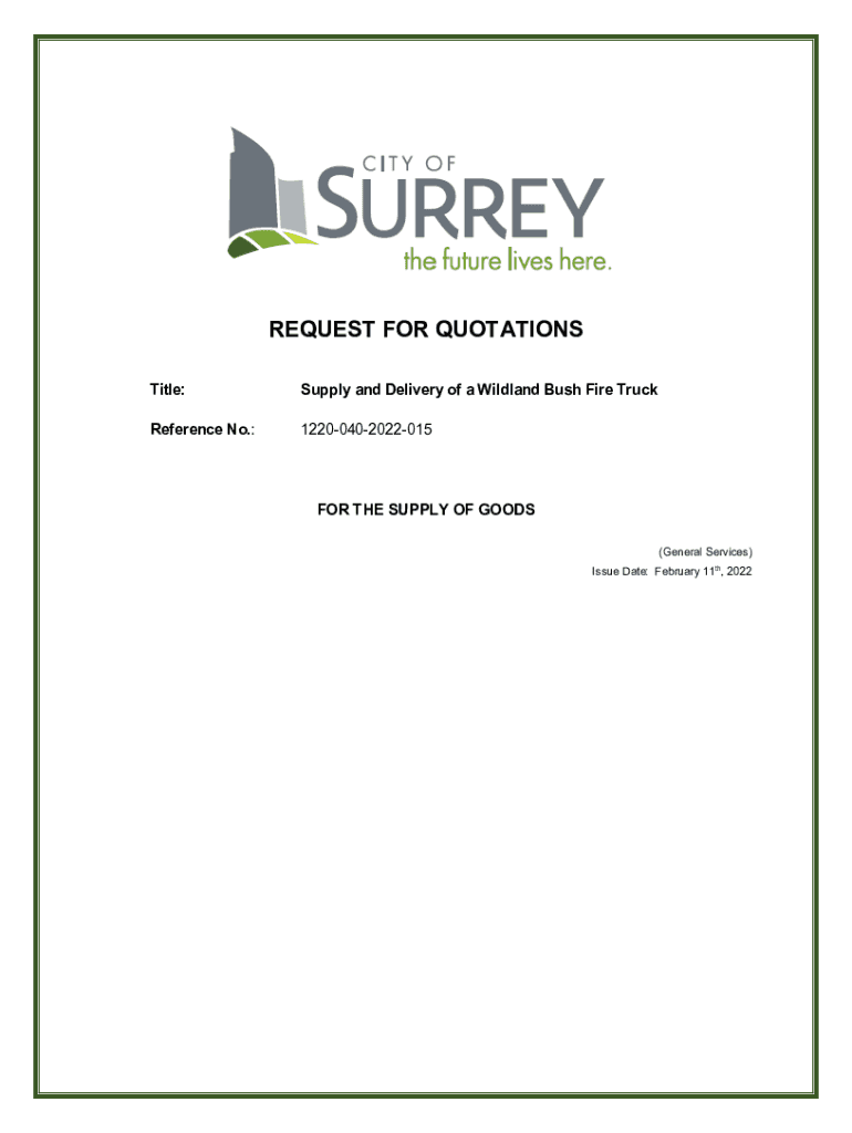 REQUEST FOR QUOTATIONS Title:Supply and Delivery of a Wild land Bush Fire TruckReference No.:12200402022015FOR THE SUPPLY OF GOODS (General Services) Issue Date: February 11th, 2022TABLE OF CONTENTS