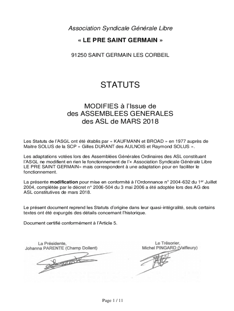 Association Syndicate GRALE Libra LE PRE SAINT GERMAIN 91250 SAINT GERMAIN LES CORBEILSTATUTS MODIFIES issue de DES ASSEMBLIES GENERALS DES ASL de MARS 2018 Les Status de large ONT t tables par KAUFMANN