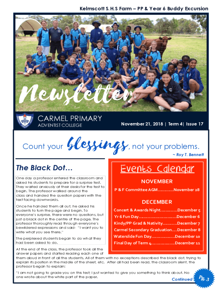 Ellicott S.H.S Farm PP & Year 6 Buddy ExcursionNewsletter CARMEL PRIMARY ADVENTIST COLLEGECount your November 21, 2018 | Term 4| Issue 17blessingsThe Black Dot One day a professor entered the classroom