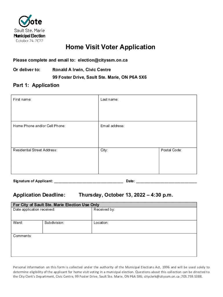 Home Visit Voter Application Please complete and email to: election@cityssm.on.ca Or deliver to:Ronald A Irwin, Civic Center 99 Foster Drive, Salt Ste. Marie, ON P6A 5×6Part 1: Application First