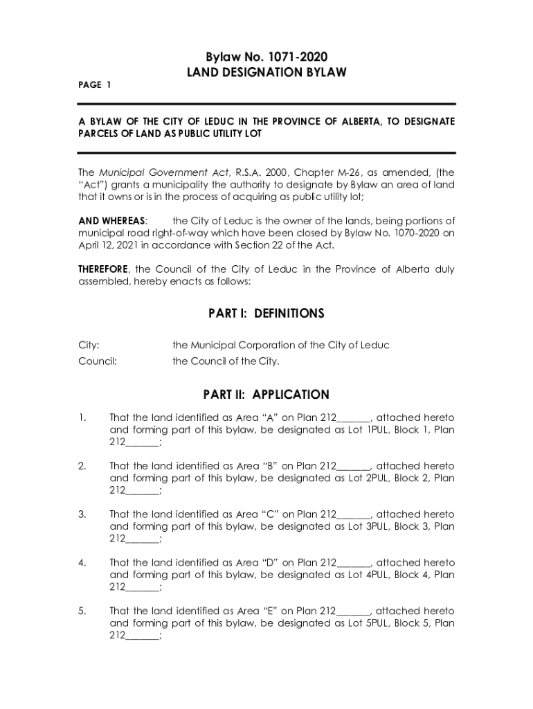Bylaw No. 10712020 LAND DESIGNATION BYLAW PAGE 1A BYLAW OF THE CITY OF EDUC IN THE PROVINCE OF ALBERTA, TO DESIGNATE PARCELS OF LAND AS PUBLIC UTILITY Lottie Municipal Government Act, R.S.A. 2000,