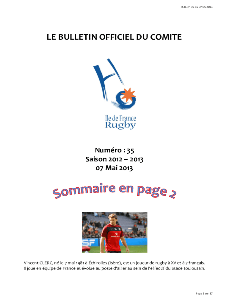 B.O. n 35 Du 07.05.2013LE BULLETIN OFFICIAL DU COMITENumro : 35 Saigon 2012 2013 07 Mai 2013Vincent CLERK, n LE 7 Mai 1981 chipotles (Ire), est un joker de rugby XV et 7 Francis. IL Joe en quite de