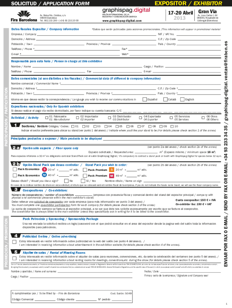EXPOSITOR / EXHIBITORSOLICITUD / APPLICATION FORM Av. Ran Ma. Cristina, s/n 08004 Barcelona Tel. 902 233 200 (+34) 93 233 20 00Via 1720 April Av. Gran Joan Charles I, 64 08908 Hospital DE 2013 Llobregat