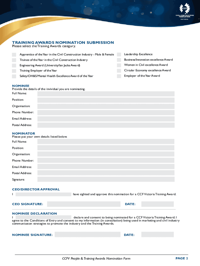 THE CCF VICTORIAPEOPLE & TRAINING AWARDS20232023 NOMINATION FORM WELCOME Thank you for your interest in the Civil Contractors Federation Victoria 2023 Training Awards. These Awards acknowledge outstanding