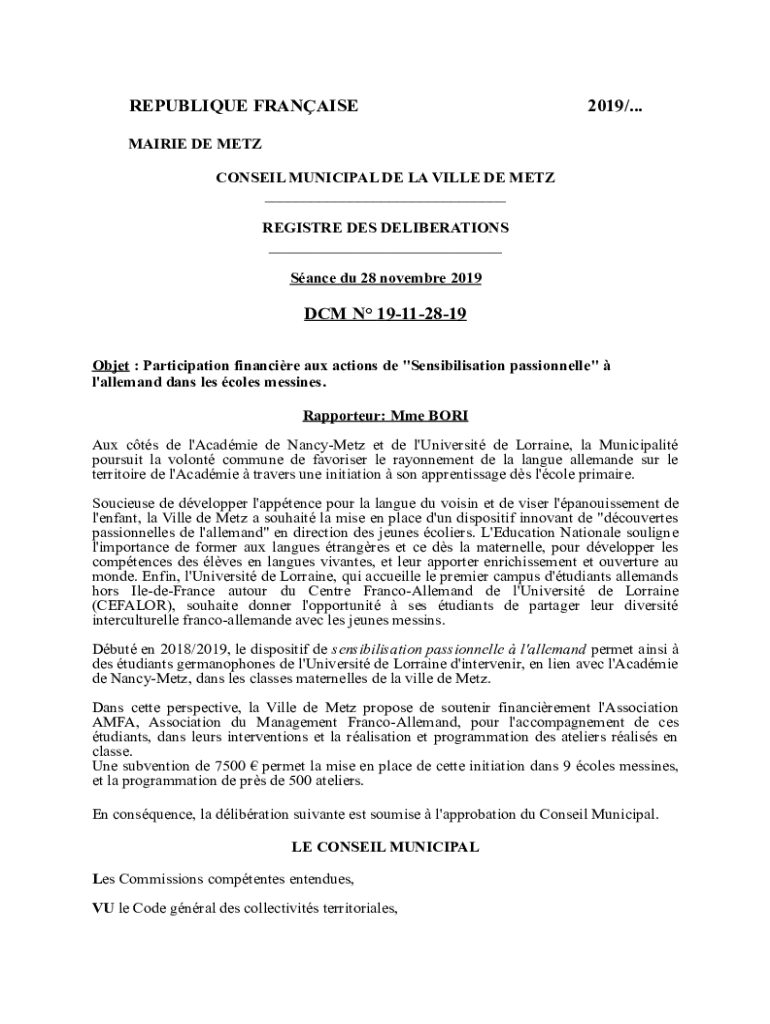 REPUBLICAN FRANAISE2019/...MARIE DE METZ CONSENT MUNICIPAL DE LA VILLA DE METZ ___ REGISTRY DES DELIBERATIONS ___ Since Du 28 November 2019DCM N 19112819 Objects : Participation financier aux actions