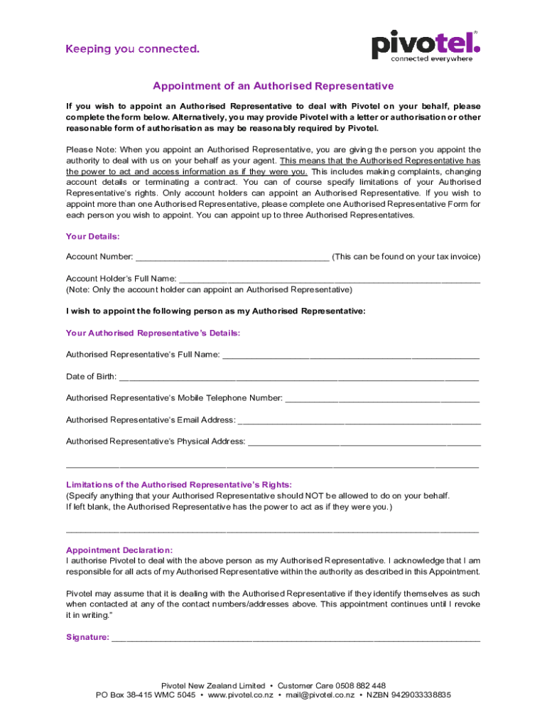 Appointment of an Authorized Representative If you wish to appoint an Authorized Representative to deal with Pivotal on your behalf, please complete the form below. Alternatively, you may provide