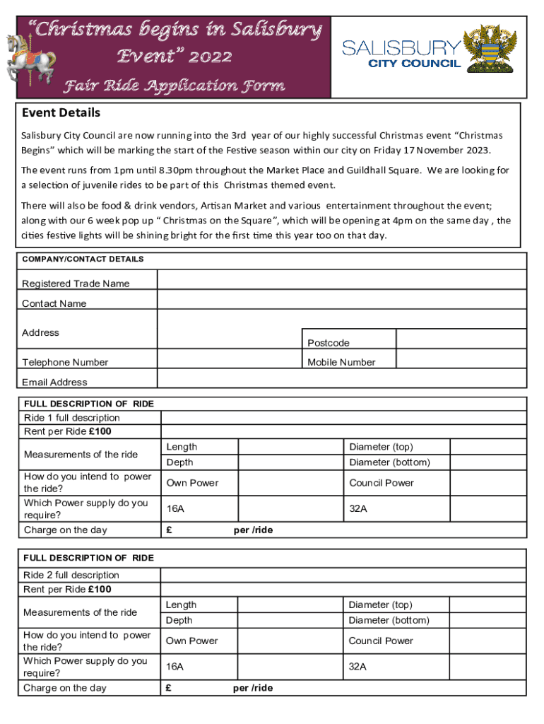 Christmas begins in SalisburyEvent 2022 Fair Ride Application Form Event Details Salisbury City Council are now running into the 3rd year of our highly successful Christmas event Christmas Begins