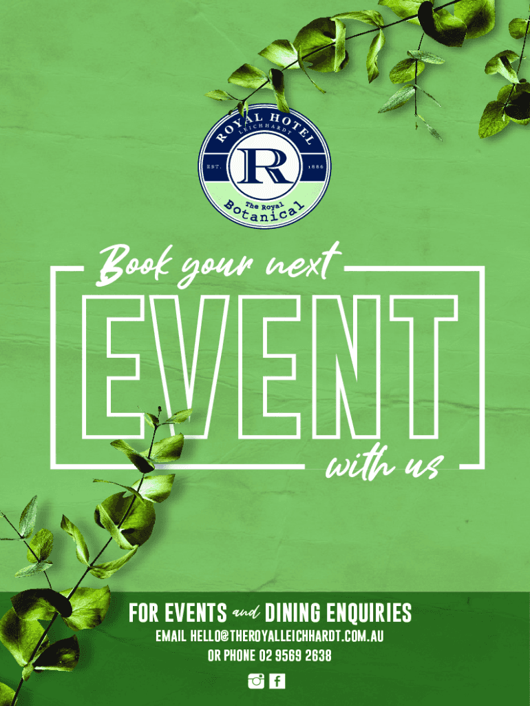 ROYAL HOTELRNOL HO Y AS T. L E I C H H T OR T O N AL ERD TRL ERD TL HO Y AS T. L E I C H H T OR T O NA Book your next with us FOR EVENTS and DINING Inquiries EMAIL HELLO@THEROYALLEICHHARDT.COM.AU