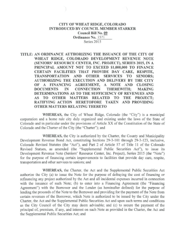 CITY OF WHEAT RIDGE, COLORADO INTRODUCED BY COUNCIL MEMBER STARKER Council Bill No. 09 Ordinance No. 15 71 Series 2015TITLE: AN ORDINANCE AUTHORIZING THE ISSUANCE OF THE CITY OF WHEAT RIDGE, COLORADO
