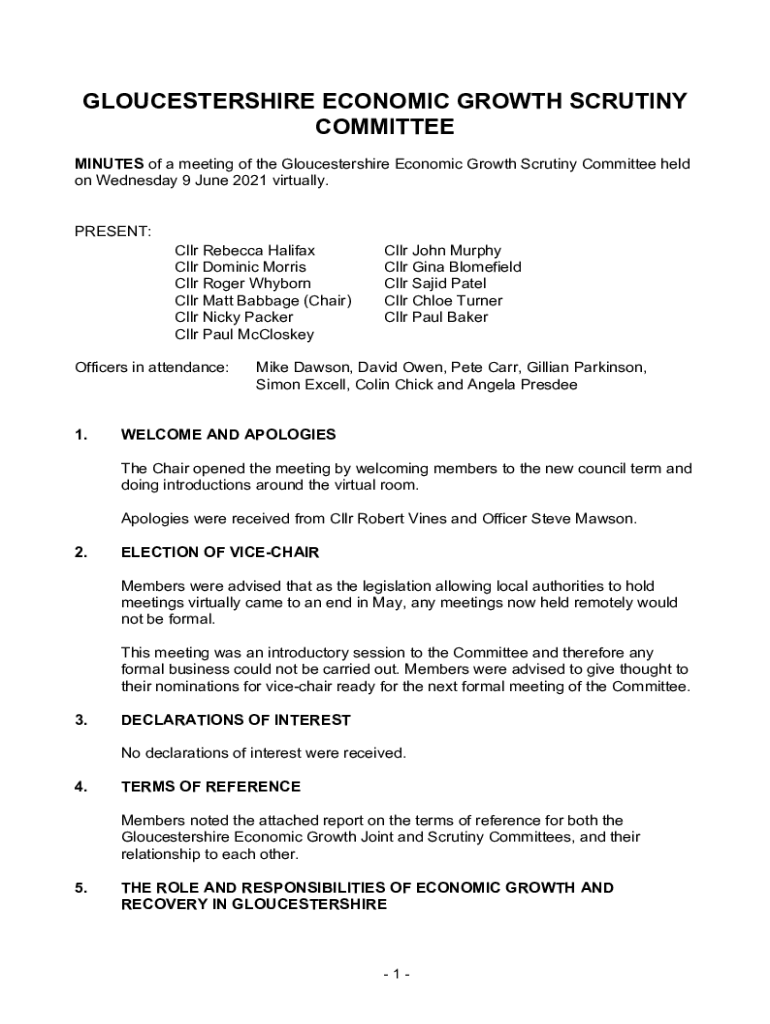GLOUCESTERSHIRE ECONOMIC GROWTH SCRUTINY COMMITTEE MINUTES of a meeting of the Gloucestershire Economic Growth Scrutiny Committee held on Wednesday 9 June 2021 virtually. PRESENT: CLR Rebecca Halifax