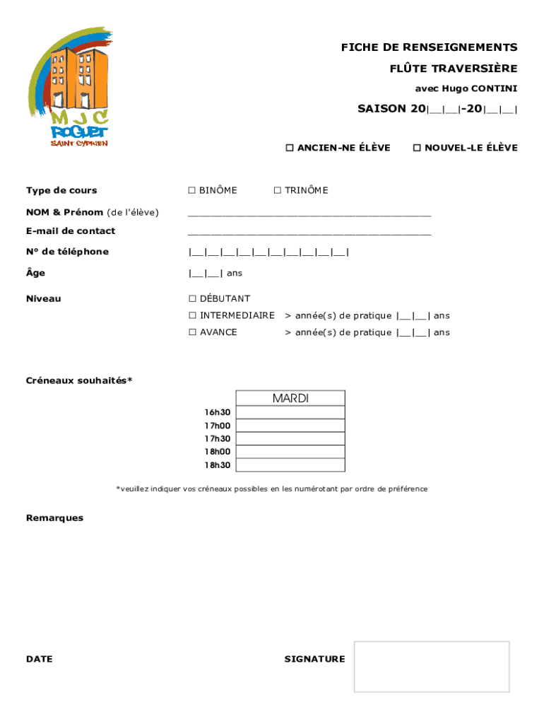 Remplissez toutes les informations demandées dans la fiche de renseignements FLTE.