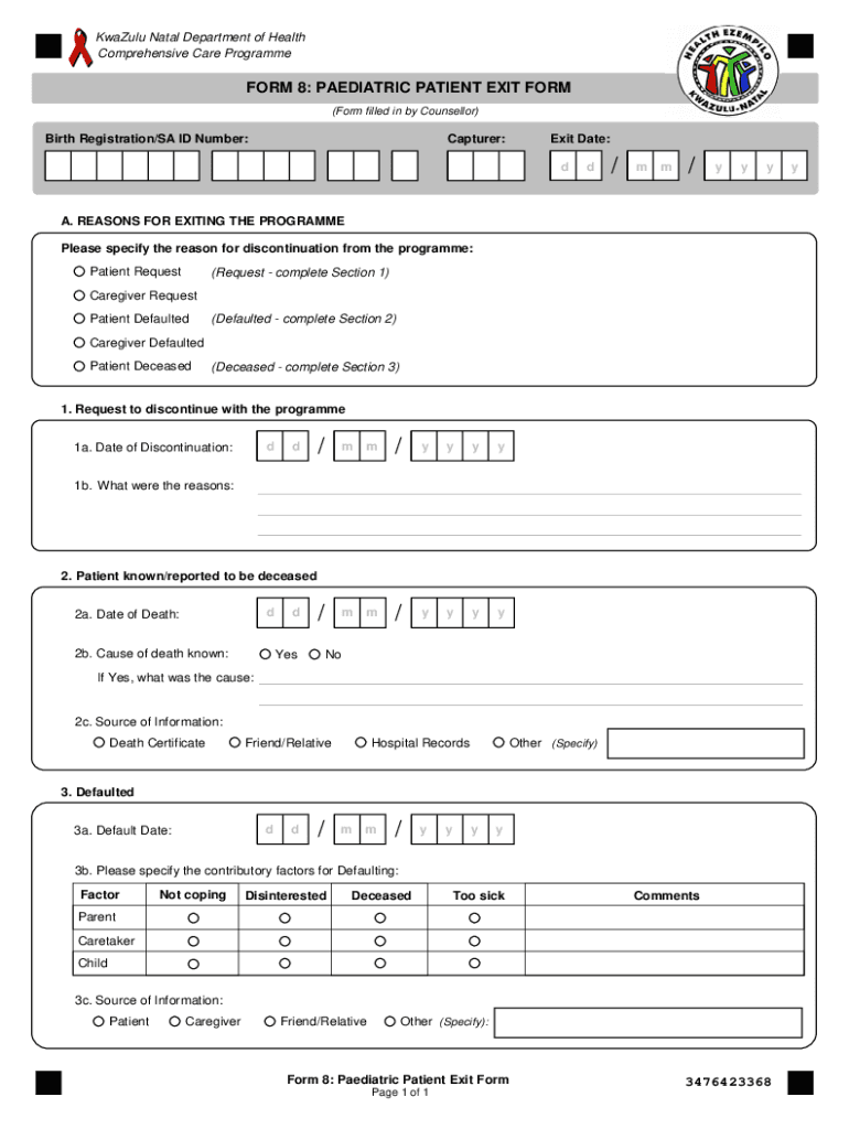 Kabul Natal Department of Health Comprehensive Care Programmer 8: Pediatric PATIENT EXIT FORM (Form filled in by Counselor)Birth Registration/SA ID Number:Captured:Exit Date: dd/mm/YYY. REASONS FOR