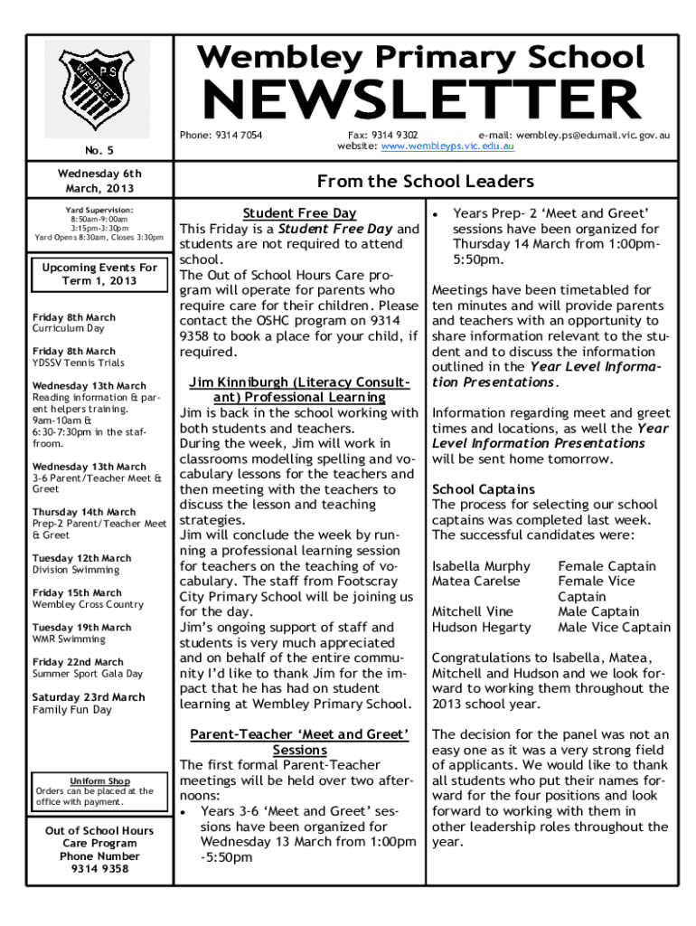 Phone: 9314 7054No. 5 Wednesday 6th March 2013 Yard Supervision: 8:50am9:00am 3:15pm3:30pm Yard Opens 8:30am, Closes 3:30pmUpcoming Events For Term 1, 2013 Friday 8th March Curriculum Day Friday 8th