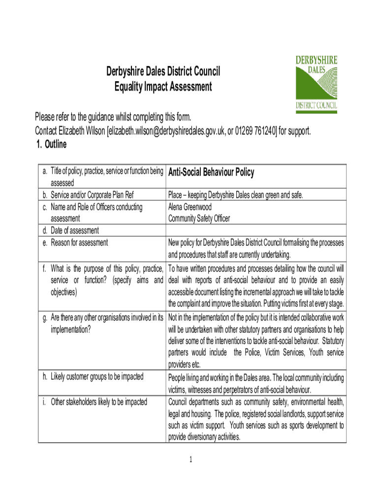 Derbyshire Dales District Council Equality Impact Assessment Please refer to the guidance whilst completing this form. Contact Elizabeth Wilson [elizabeth.wilson@derbyshiredales.gov.uk, or 01269 761240]